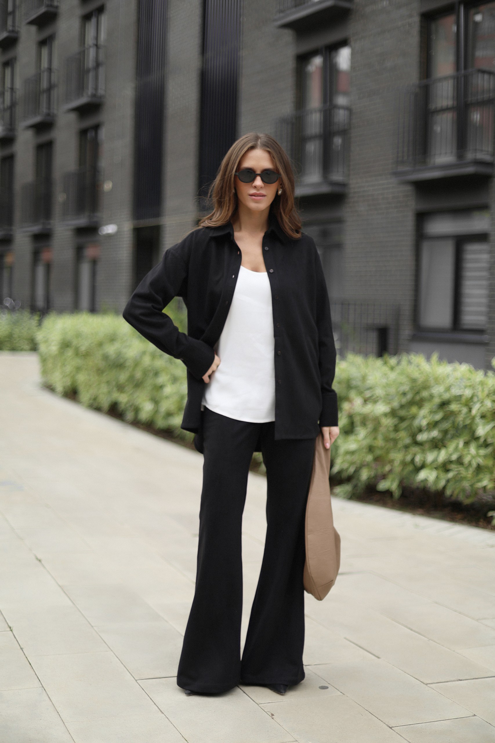 Особенности: отложной воротник, пуговицы, спущенное плечо, пояс-резинка, высокая посадка брюк, карманы, брюки-клеш