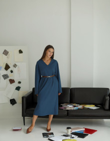 Особенности: потайная планка с пуговицами, отложной воротник, втачной рукав с манжетами, пояс в комплекте, высокая застежка на рукавах