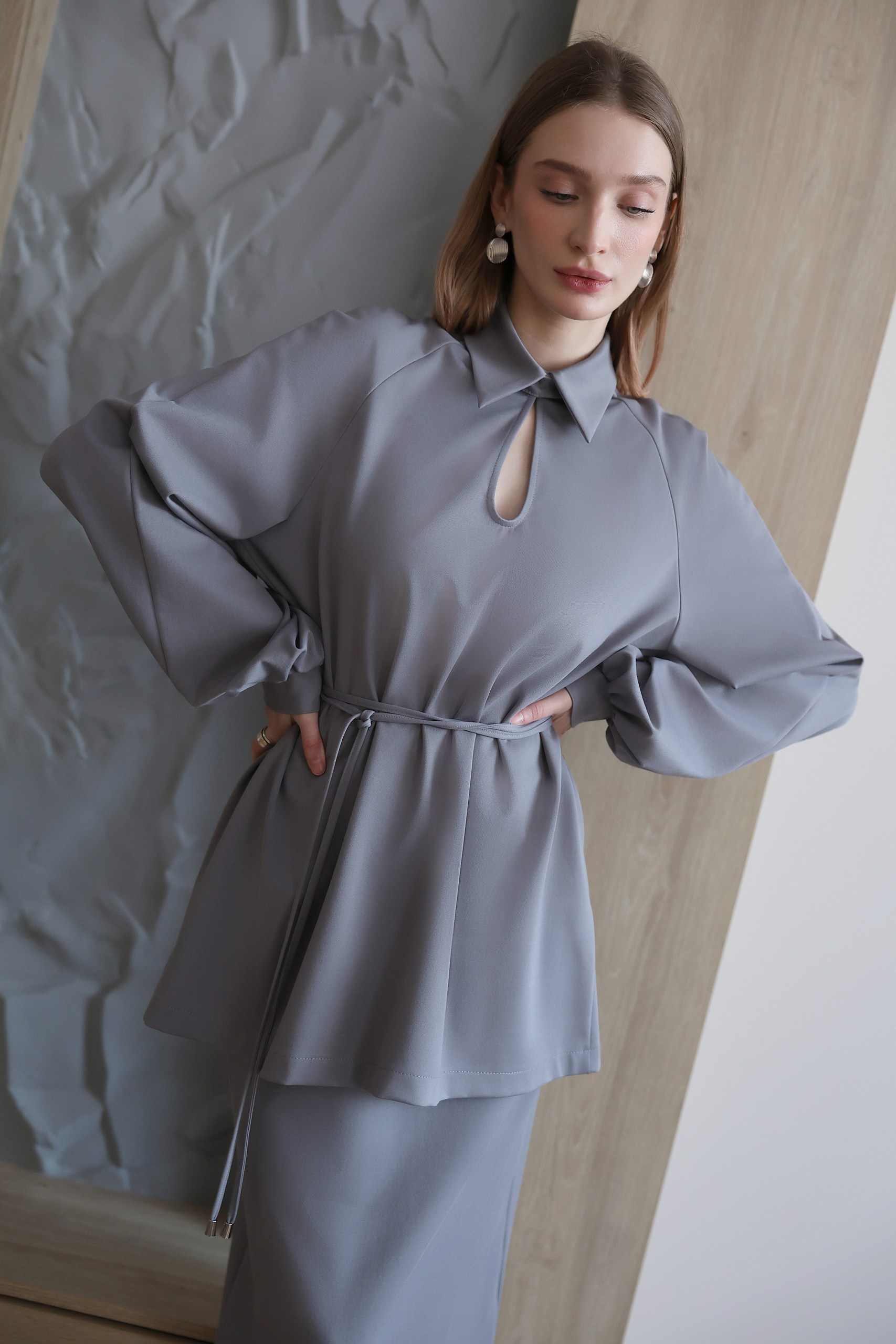 Особенности: отложной воротник, рукав-реглан, сборка у манжет, вырез "капелька" на пуговице