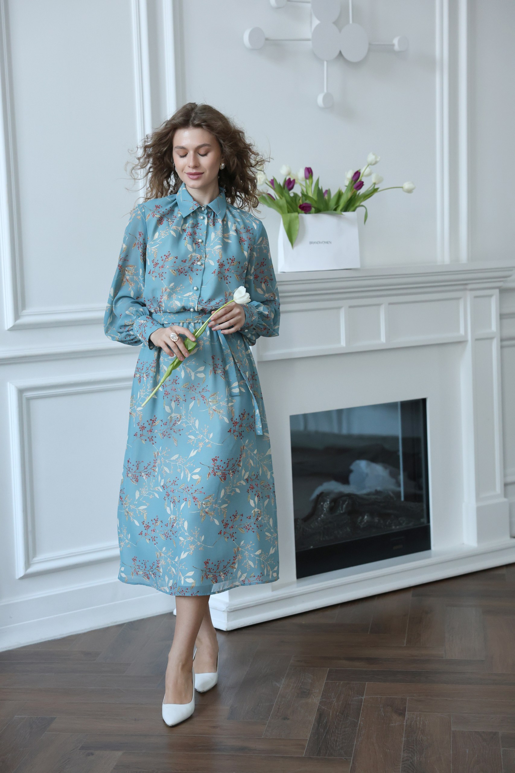 Воплощение женственности и легкости. Это голубое платье из шифона с деликатным цветочным принтом создано для романтичных прогулок и особенных событий. Классический рубашечный воротник придает образу собранность, а летящая юбка - динамику и воздушность.