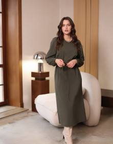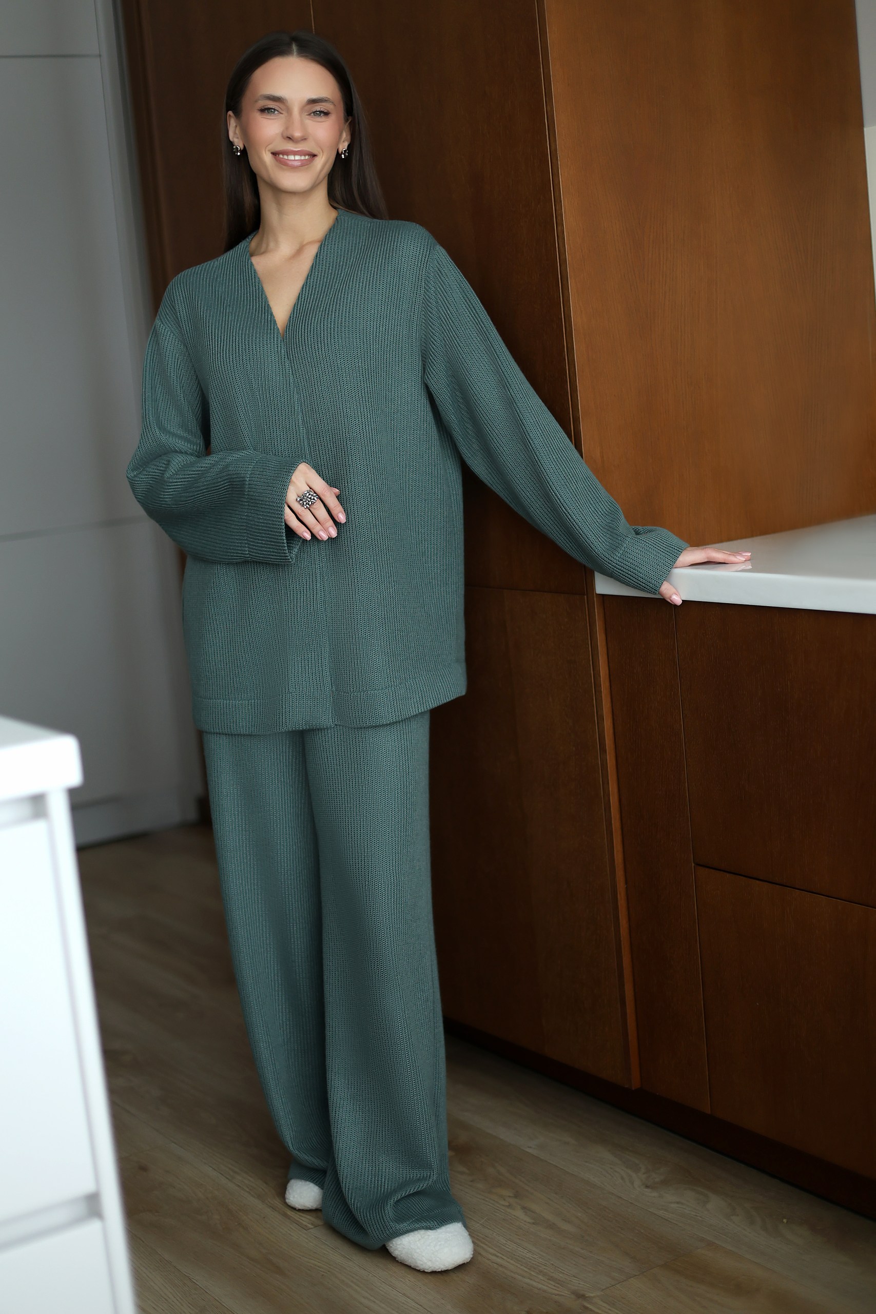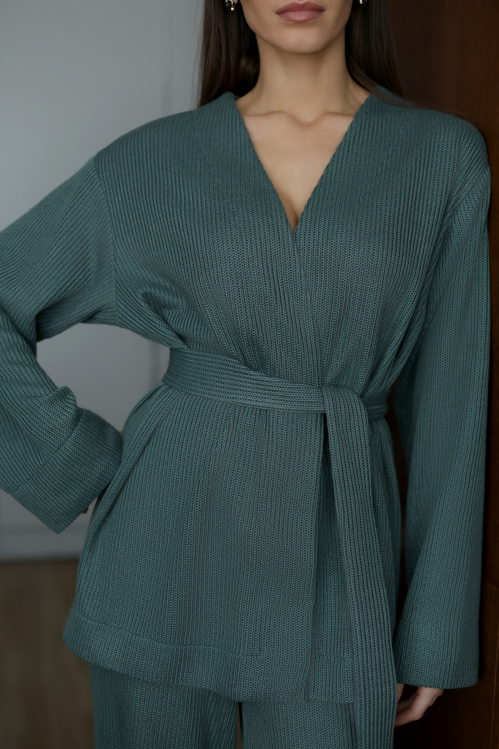 Особенности: V-образный вырез, спущенная линия плеча, магнитная застежка, свободного кроя брюки на резинке, пояс в комплекте