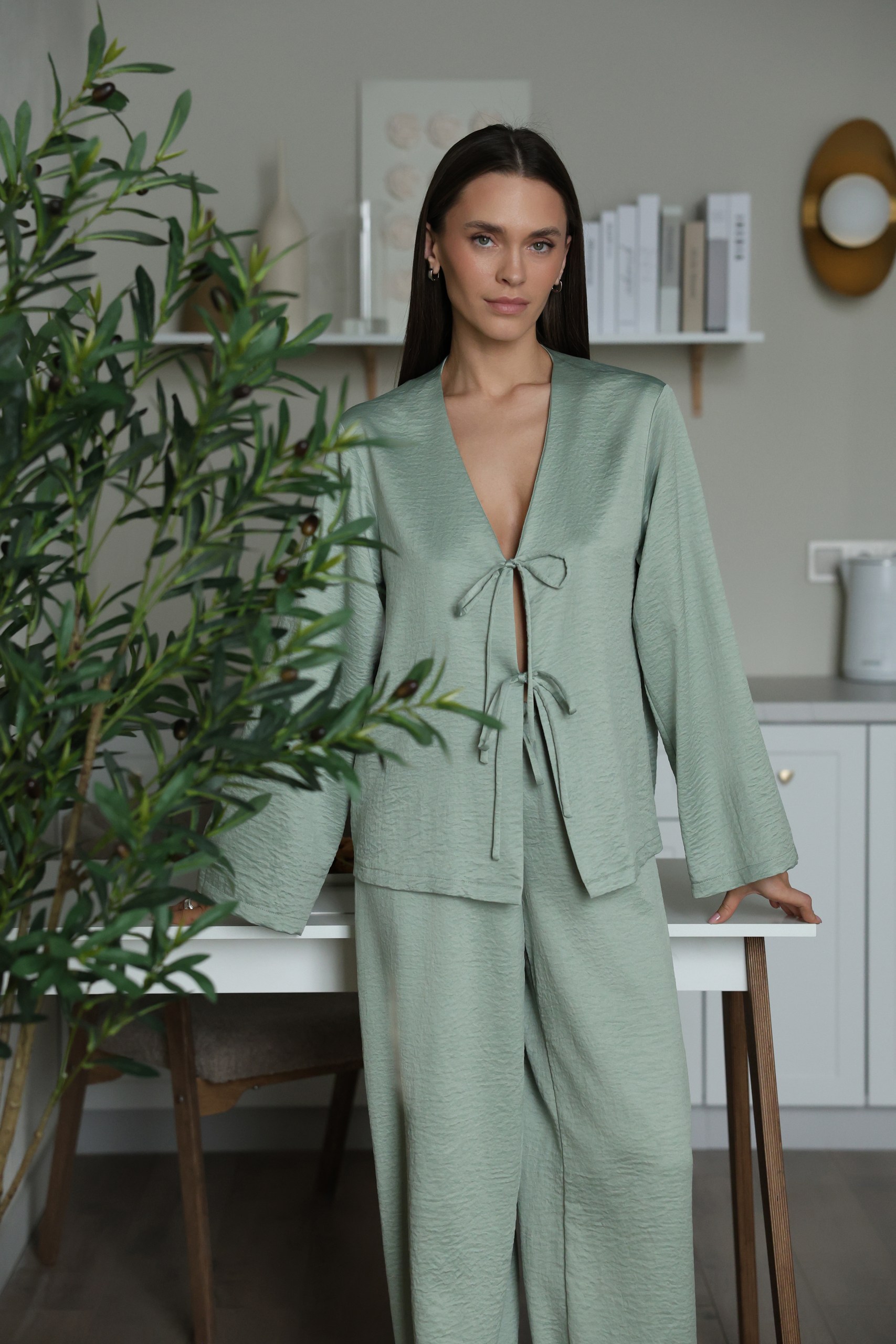 Комплект блуза с завязками и свободного кроя брюки из струящийся ткани Новинка Хит