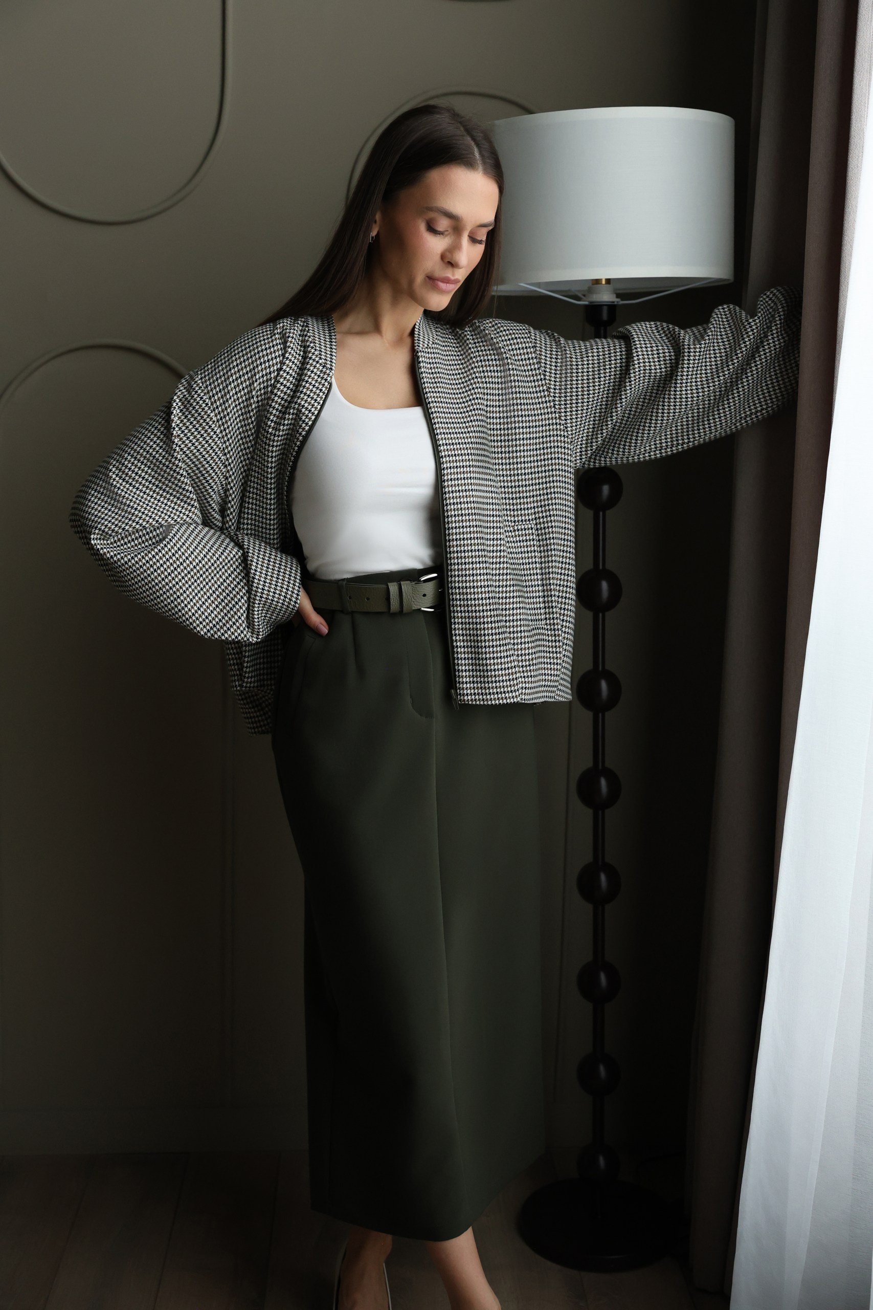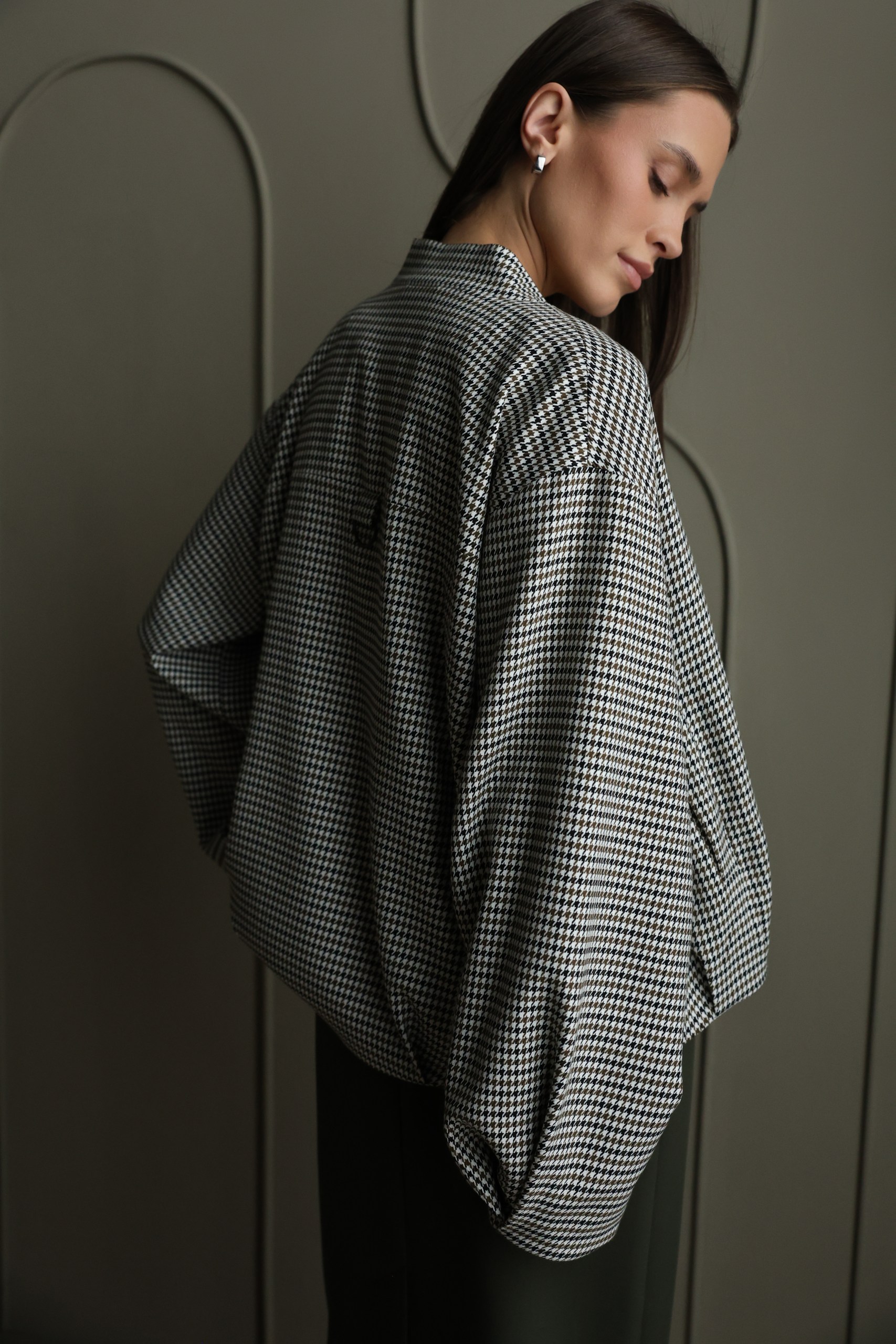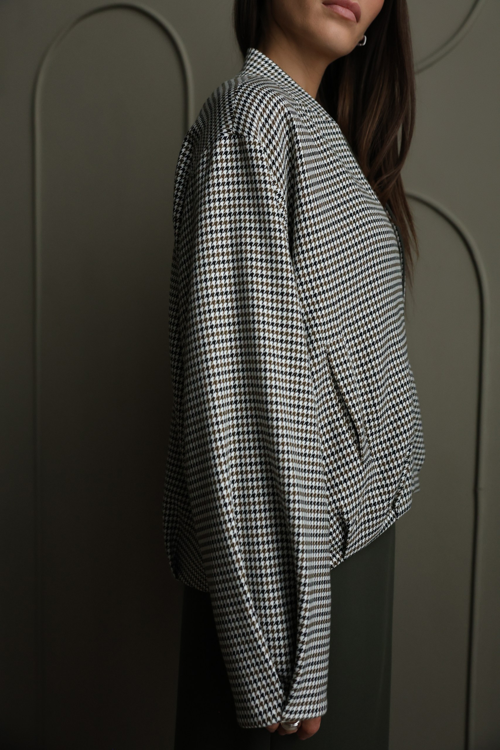 Жакет на молнии с объемными рукавами с принтом "гусиная лапка" на подкладе